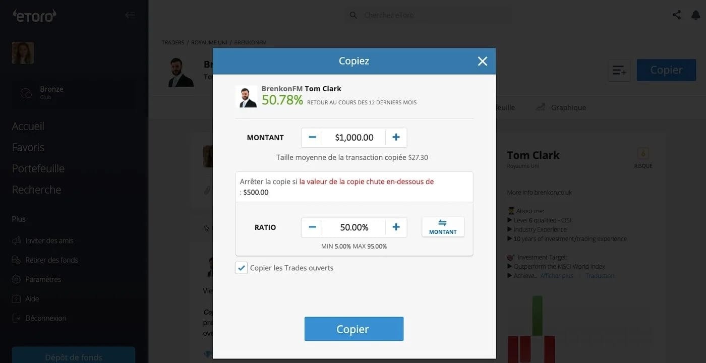 Une fois que vous avez trouvé le trader qui vous convient, il ne vous reste plus qu’à cliquer sur son profil, à cliquer sur “Copier” et à choisir le montant à investir, si vous souhaitez copier les trades ouverts et le montant que vous acceptez de perdre. Le montant que vous accepter de perdre est en réalité un stop loss qui vous permet de vous protéger.