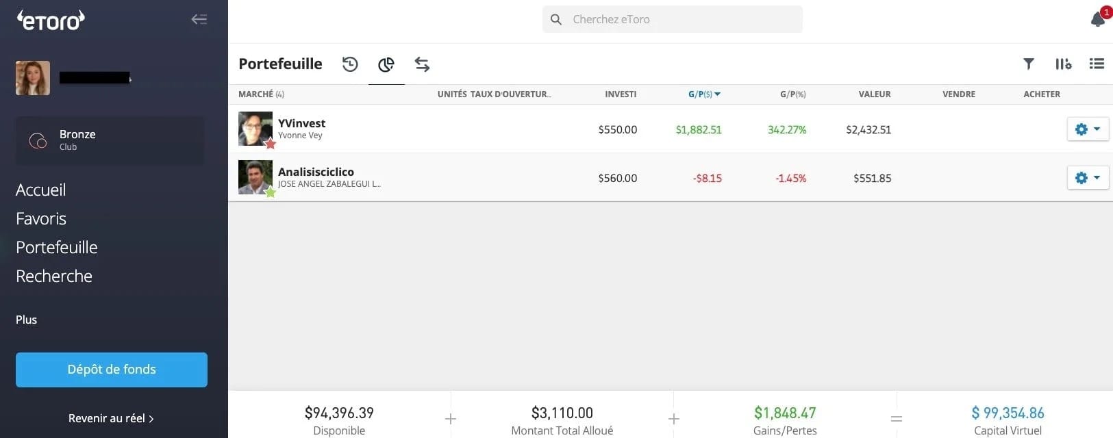 Point important, sur eToro, vous pouvez suivre très facilement l’évolution de vos positions en copy trading et heureusement d’ailleurs ! Depuis votre portefeuille, vous pouvez suivre vos positions, investir plus, mettre en pause le copy trading, retirer votre argent ou ajuster le stop loss si vous le souhaitez.