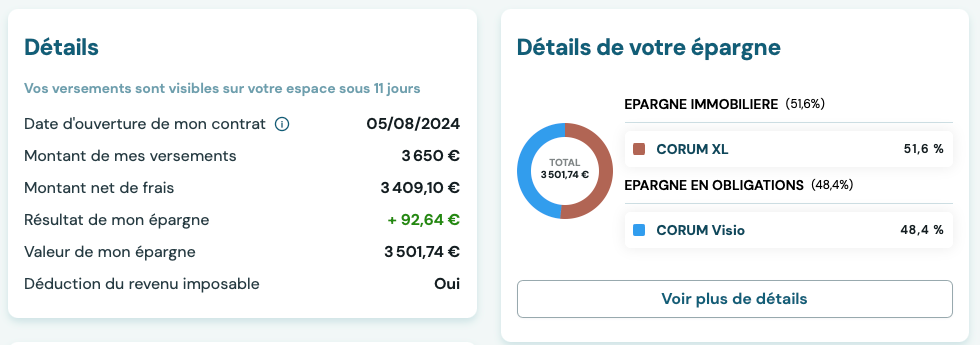 L’avis d’Alexandre : En 2024, j’ai ouvert un PER auprès de Corum afin de réduire mes impôts et j’en suis très satisfait. J’y ai investi 3500 € et la performance actuelle est de 3%. J’ai opté pour le PER de Corum afin d’investir dans des SCPI et recevoir des dividendes régulièrement.